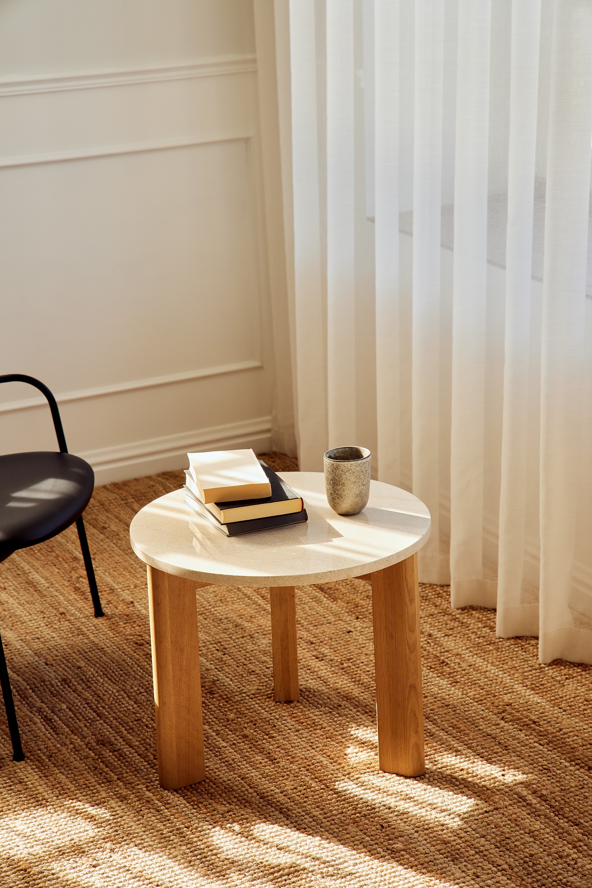 Smukt sidebord med en bordplade i marmor og robust stel i massivt egetræ inviterer Evoke til samvær. Bordpladen er et kunstværk i sig selv – de organiske åretegninger og naturlige strukturer giver hvert bord sit helt eget udtryk og tilfører rummet eksklusivitet.Marmor er et naturmateriale og der vil derfor være variationer i nuancer og struktur.