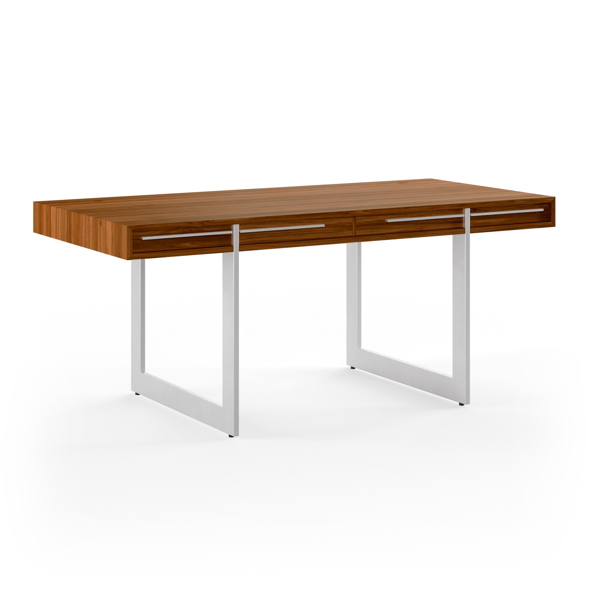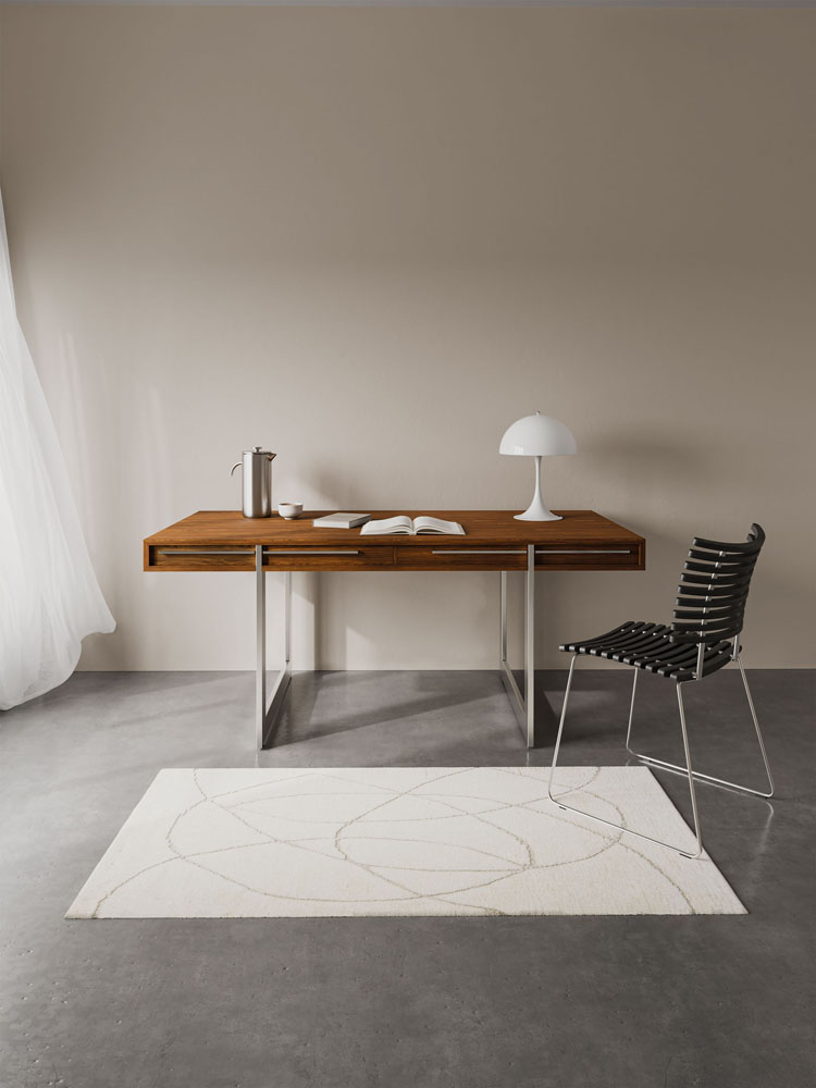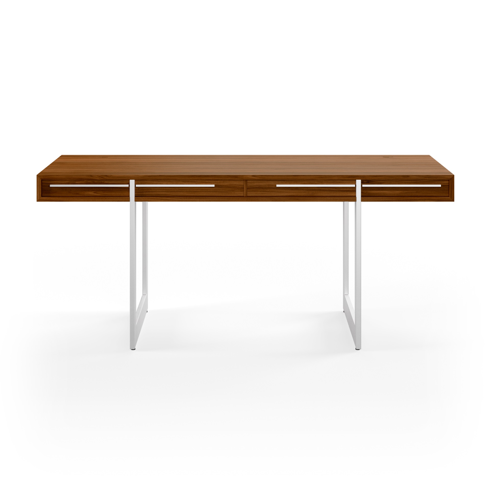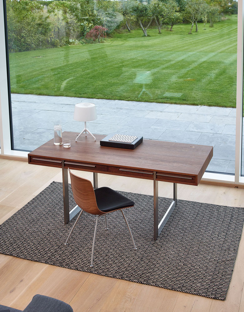 Det moderne skrivebord fra Naver er designet af Nissen & Gehl MDD. Skrivebord gemmer på et væld af smukke finesser, som kabelhuller i bordpladen, samt skjult ledningsføring gemt i bordet. Skufferne er sinket flot sammen med svalehaler. Den varme glød fra træet står i et flot samspil med de smalle ben i rustfrit stål, der giver det store skrivebord et næsten svævende udtryk. Det rustfrie stål går igen på skuffefronterne.