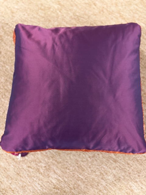 Puden er lys lilla på den ene side og lilla på den anden og en brændt orange kant omkring hele puden.