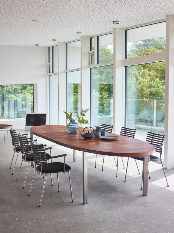 GM 2100 er en serie af klassiske spiseborde med sans for detaljen og træet i fokus. Den elegante spisebordsserie, designet af Nissen og Gehl, fremstilles med en bordplade helt i træ og bordben i rustfrit stål – som på raffineret vis integreres med den massive bordplade.